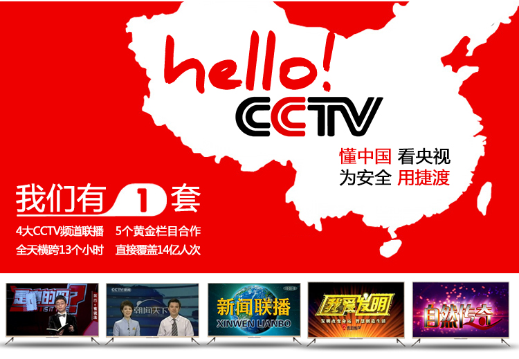 2016年,既是央視品牌升級的重要時刻,也是JADO捷渡中國攜手央視的品牌傳播之旅。6月開始,JADO捷渡中國央視廣告片全面登陸央視四大頻道(CCTV1綜合頻道、CCTV2財經頻道、CCTV10科教頻道、CCTV13新聞頻道)和五大黃金欄目(CCTV1《新聞聯播》《朝聞天下》、CCTV2《是真的嗎》、CCTV10《我愛發明》《自然傳奇》、CCTV13《朝聞天下》)合作。廣告開播以來,JADO捷渡品牌的知名度和美譽度得到了相應的提高。