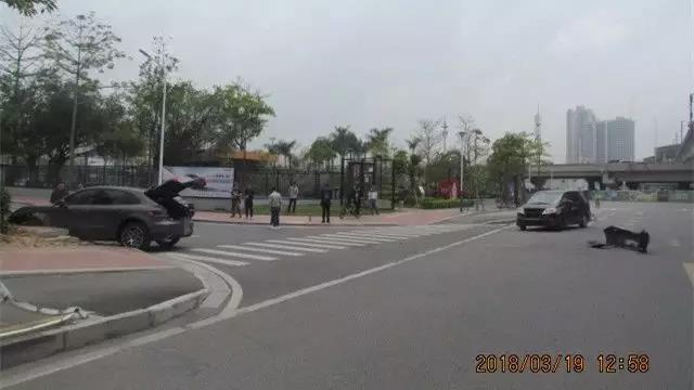 2018年3月19日,在廣東珠海,一輛保時捷車行駛在港昌路最右側車道上,被左側的一輛本田車突然地向右變道給撞到左側車身,然后失控朝著右前方的路基沖去,撞到水泥底座才停下。