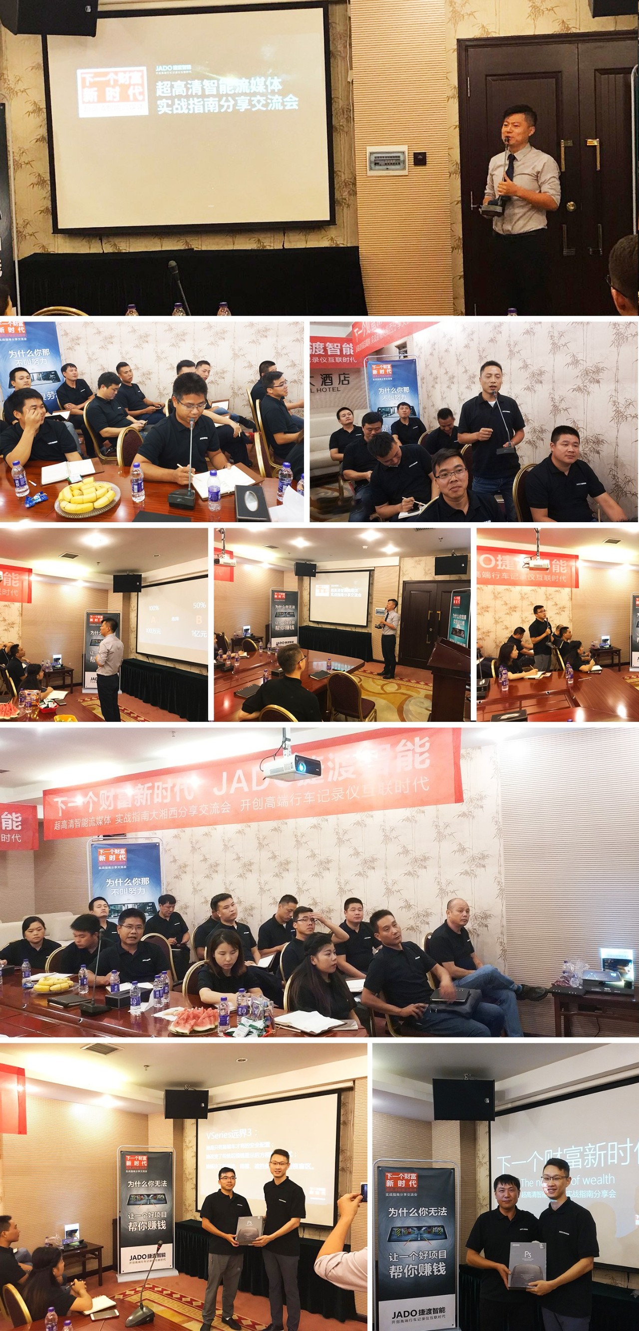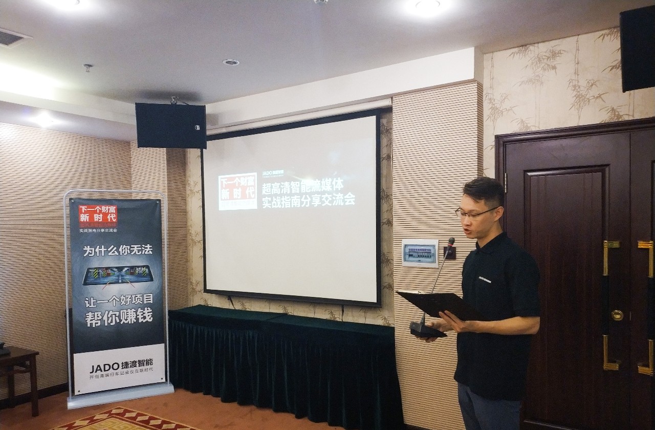 隨后,JADO捷渡智能(中國)戰區負責人杜新先生也做了分享和交流,杜新先生首先為大家分享了VSeries遠界3——超高清智能流媒體后視鏡產品的銷售技巧,講解了產品在未來的發展空間和趨勢,年輕化和創新的商業模式將會成為新一代的主流。并通過對目前全國一些優秀終端店的成功經驗的總結,以及不同區域的市場特點的分析,讓現場30余家終端店老板獲取到了有價值的分享,博得了現場終端店老板們的一致喝彩和好評。
